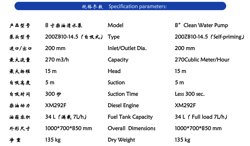 Diesel 8-inch water pump is a high-efficiency water pump equipment specially designed for drainage, irrigation, firefighting and other fields with Diesel Engine as power source. Its main feature is that the impeller of the water pump is driven by the diesel engine, which can efficiently transport water from one place to another. 8-inch water pump refers to the water inlet and outlet of the pump body with a diameter of 8 inches (about 20 cm), with a large flow rate and high head, suitable for large flow and high head water treatment needs.